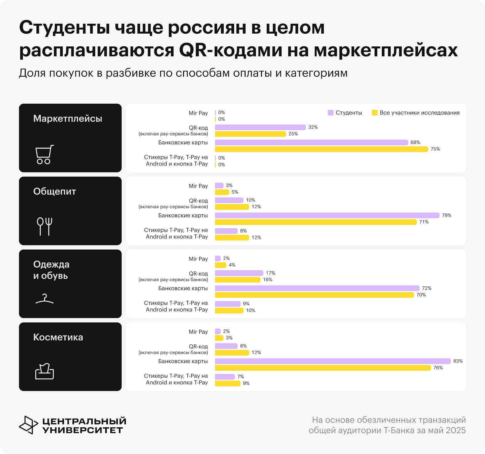 - Студенты чаще, чем россияне в целом, используют QR-коды для покупок на маркетплейсах — 32% платежей против 25%.