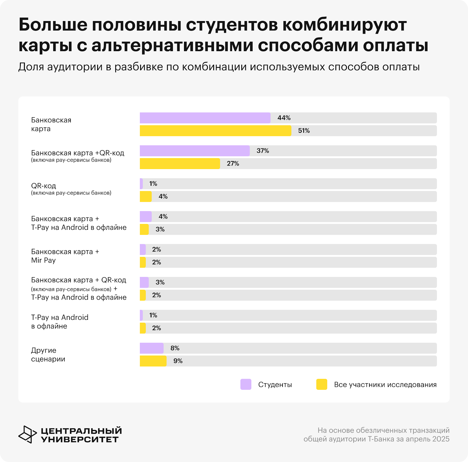 В 2025 году больше половины россиян используют для совершения платежей только банковскую карту Среди студенческой аудитории доля меньше — 44%. Студенческая аудитория активнее сочетает разные платежные методы. Связка банковской карты и QR-кода оказалась второй по популярности: ею пользуются 37% студентов против 27% общей аудитории.