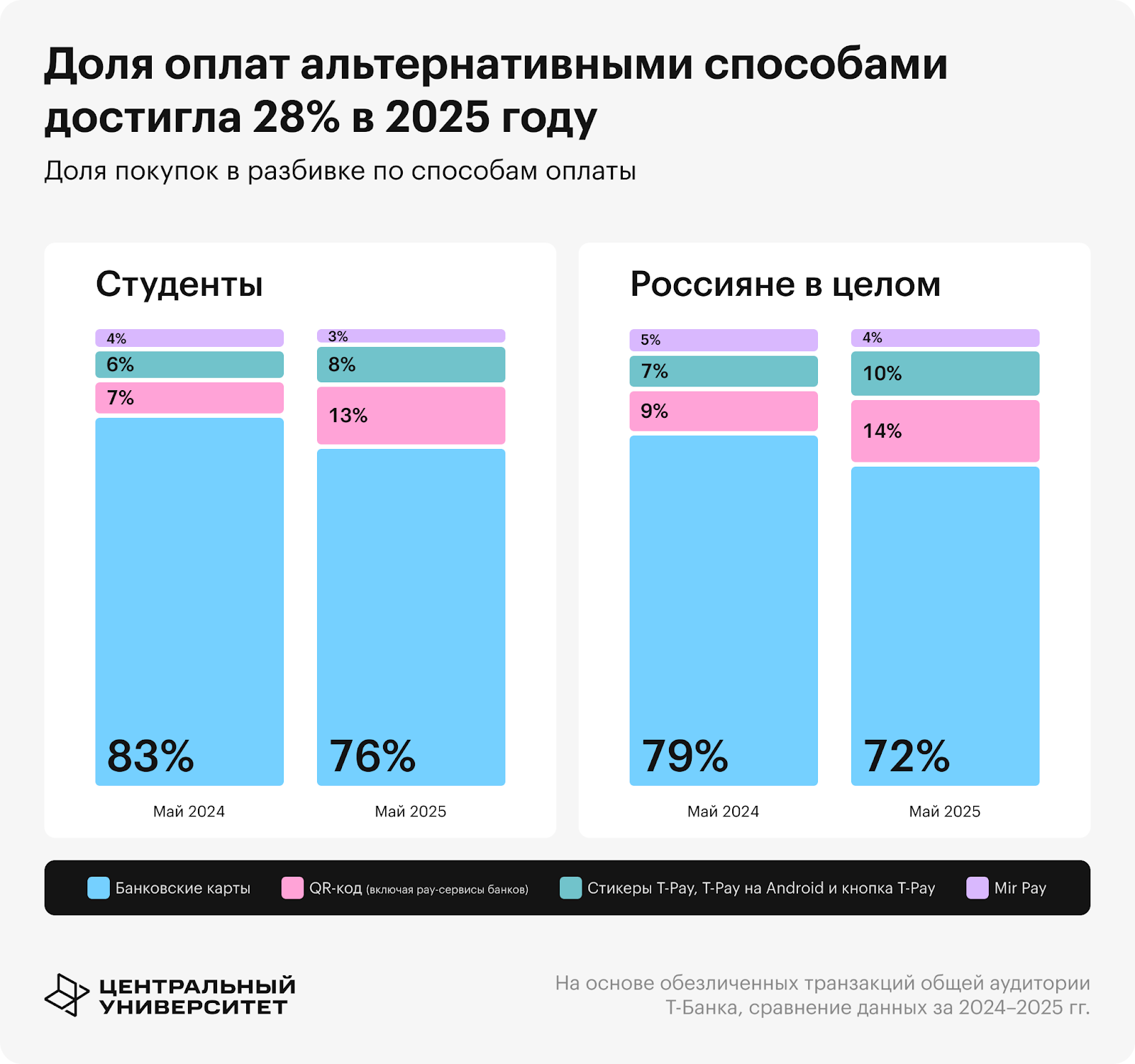 В последний год популярность банковских карт падает. К маю 2025 года количество транзакций через пластиковые карты сократилось у студентов с 83 до 76%. Среди россиян в целом — с 79 до 72%.