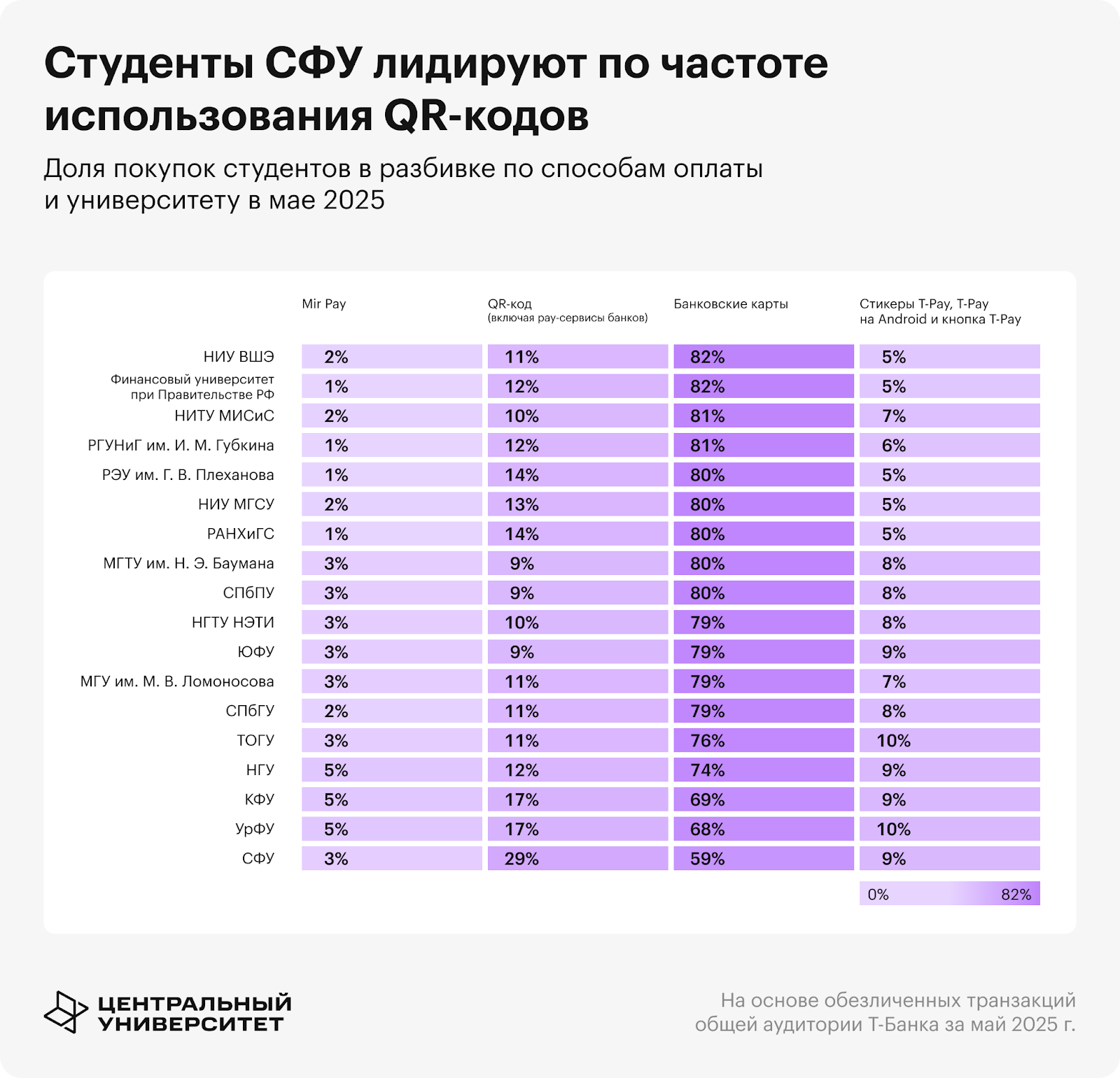 Анализ охватил более 50 млн жителей России. Студенческая аудитория (возраст 17—23 года и регулярная финансовая активность на территории университетских кампусов в период 2019—2025 годов) составила 305 тысяч человек из более чем 150 университетов. Для расчета метрики мультисценарности (использования нескольких способов оплаты) учитывались только те участники исследования, кто совершил более 5 транзакций этим способом оплаты в течение месяца.